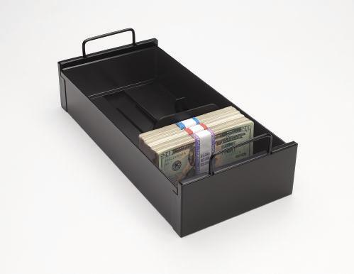 Steel Tray holds currency upright with adjustable follower block. Supplied with drop lift handles for transport. No cover. Tray size 15"W X 7 1/8"D X 3 1/4"H. Available in black color. Tray sold individually.