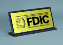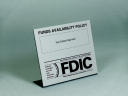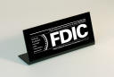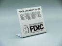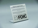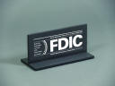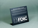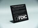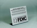 7"W X 3"H sub-surface printed FDIC sign on non-glare Lexan with 1/4" thick matte black T-stand.