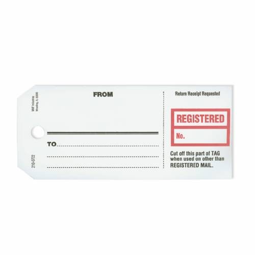 Tags with additional tear off Registered and No. section printed in red, Tags with 3/8" hole are puncture resistant, optional Imprinting available in black ink, size 2 5/8"H X 6"W. Packaged per 500 tags per box.