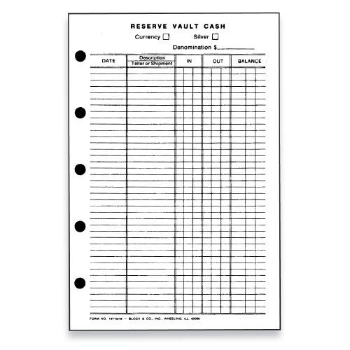 Reserve Vault Cash Control Form White two-sided form has columns for dates, description of transaction in, out, and balance for currency or silver. Form is 5 ring loose leaf for binders. Form size 5 1/2"W X 8 1/2"H. Packaged 100 per pack.