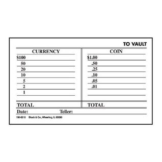 Vault Teller Slips To Vault and From Vault Teller Slips. To Vault Teller Slips are white with black ink print. From Vault Teller Slips are green with black ink print. size 5"W X 3"H. 100 sheets per pad. 5 pads per pack. Sold per pack.